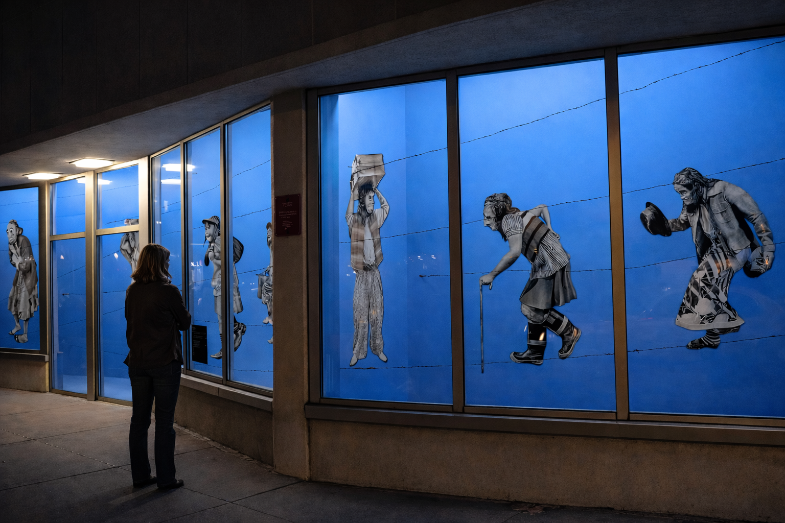 Throughout history, humans have continually migrated between lands, territories and nations. Today, legal boundaries, cultural resistance and public dialogue around immigration unfold across the world, yet personal narratives and first-hand histories are not often shared. Land Escape makes that journey visible within the Walgreens Windows with hopes of sparking dialogue and discussion around viewers’ own migration stories. While the imagery and narratives evoked here may be shared amongst communities, they are also quintessentially part of the artist’s personal story. The artist states that, “Through my work, I open the dialogue on such issues by presenting different perspectives and aim to create empathy by denouncing injustice.”