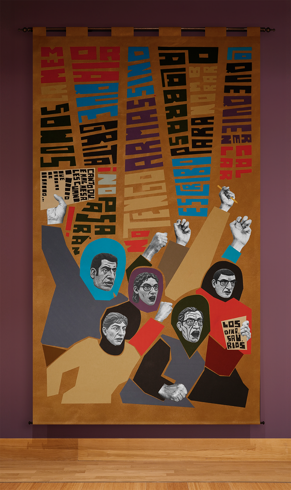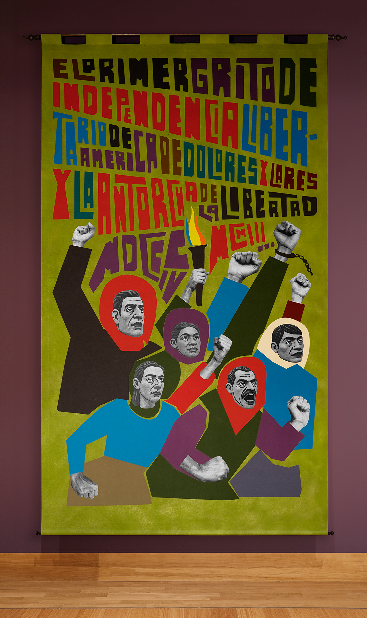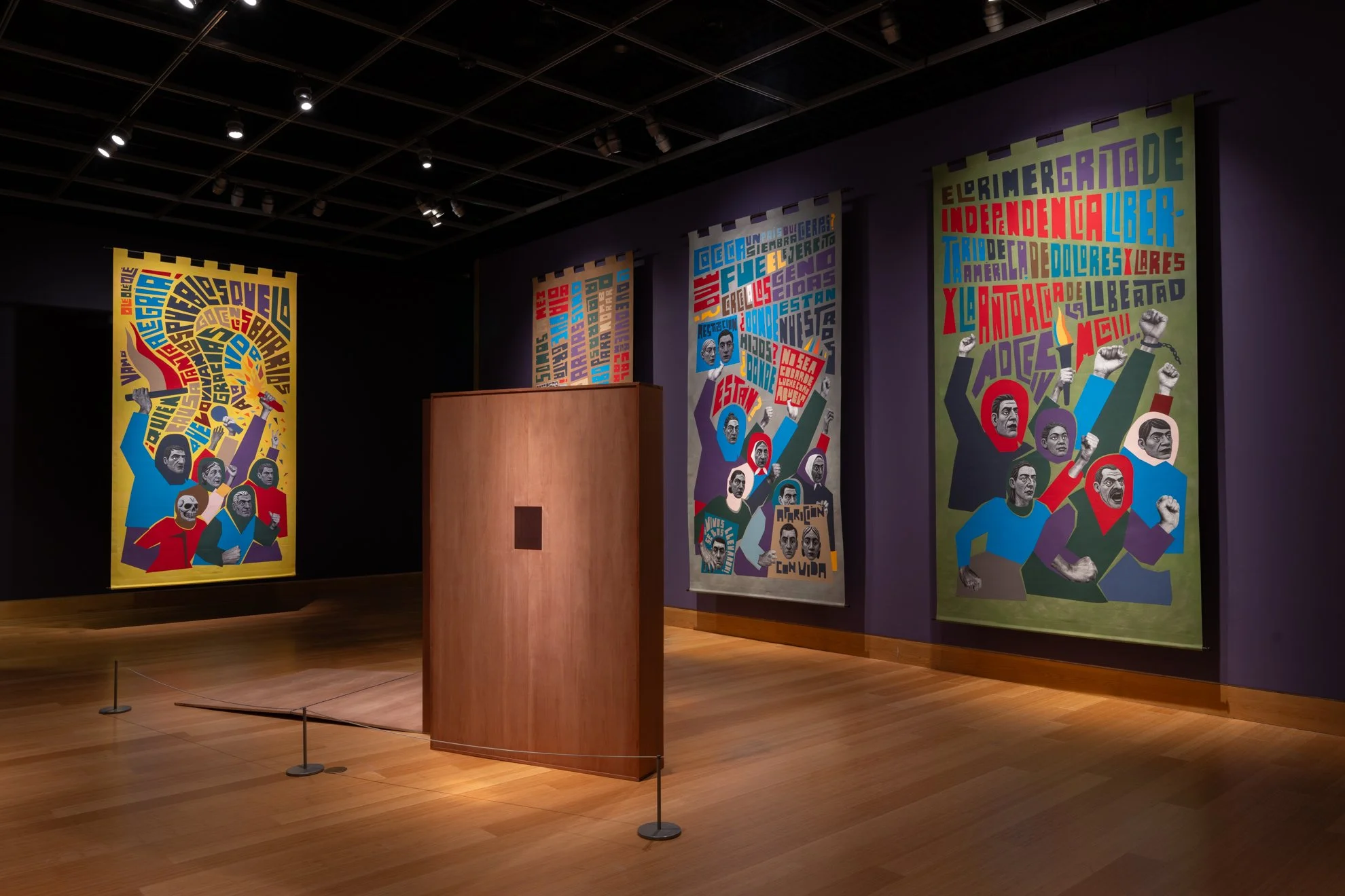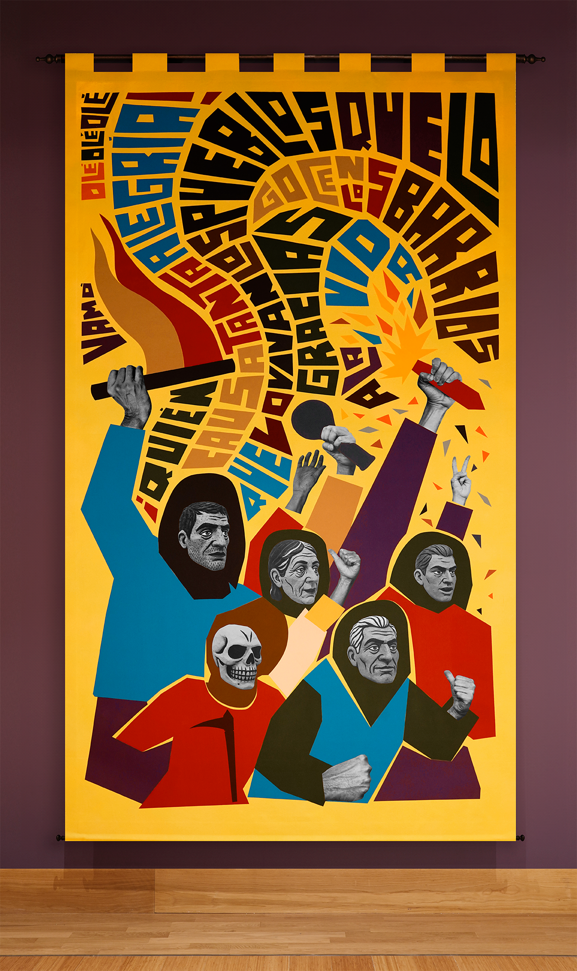 The installation consists of eight monumental fabric banners, each 14.5 × 7.5 feet, forming a continuous sequence along the wall, a civic vía crucis del pueblo, a people’s journey. The compositions mirror the gestures of bodies in procession: walking, lifting, carrying, celebrating, protesting. These are images of both the sacred and the secular—protesters, migrants, dancers, workers—united by the shared choreography of endurance.