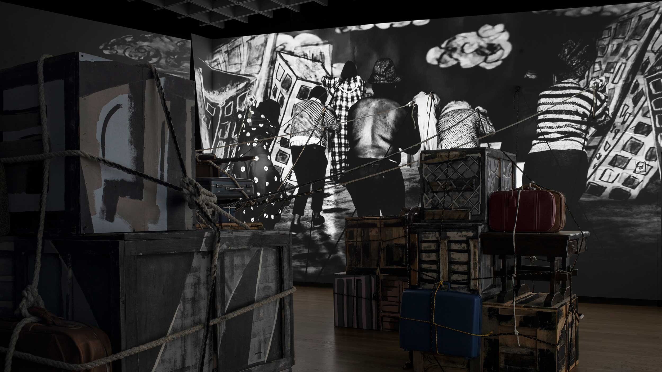 The imagery in the installation evokes a sense of endlessness and futility, emphasizing the unrelenting nature of the migrant experience. The migrants in the installation are engaged in a Sisyphean task of hauling their possessions through a never-ending cycle of illustrated cities and forest environments. While the trunks and furniture are tangible objects, they also represent the intangible aspects of migration: memories, culture, and identity. As viewers contemplate the plight of these migrants, they are forced to confront their own assumptions about the relationship between people and the things they carry with them.